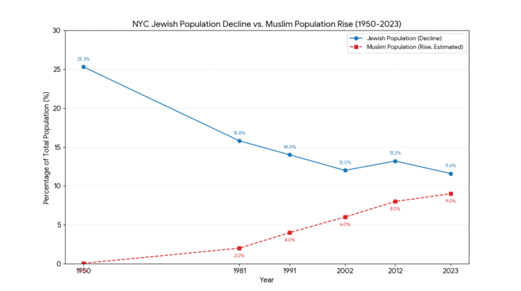 In 1989, the last year of Mayor Ed Koch’s administration, Jews outnumbered Muslims roughly 4 to 1. By 2013, the last year of Mayor Michael Bloomberg’s administration, the number of Muslims had doubled and the number of Jews continued to drop.